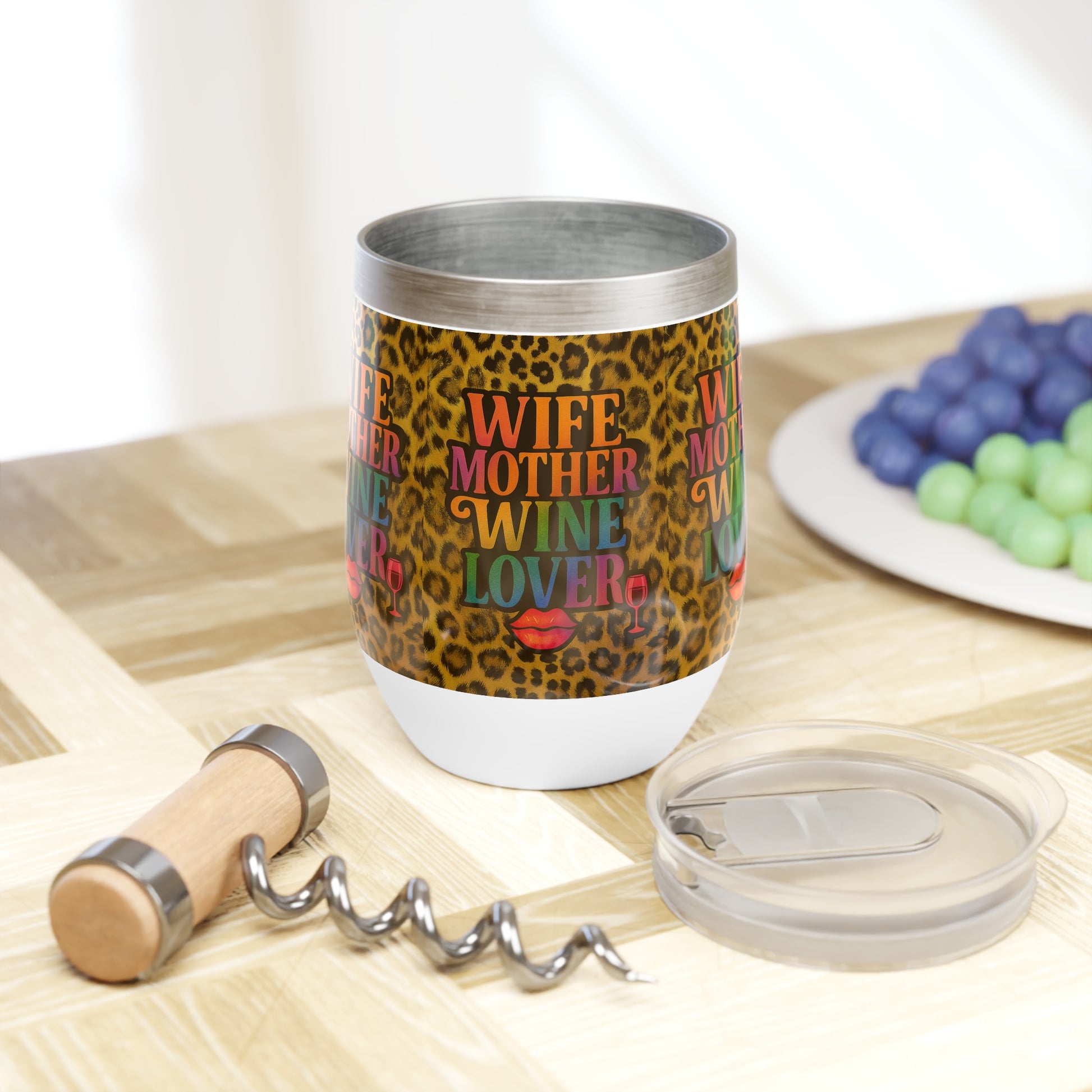 Celebrate every side of her personality with our “Wife, Mother, Wine Lover” tumbler — a bold tribute to the fabulous multitaskers who deserve their pour. This 12oz stainless steel wine tumbler flaunts a vibrant retro rainbow font on a fierce leopard print background, complete with red lips and a wine glass graphic that says it all. Whether she’s managing the home or sipping in peace, this tumbler is her must-have companion.